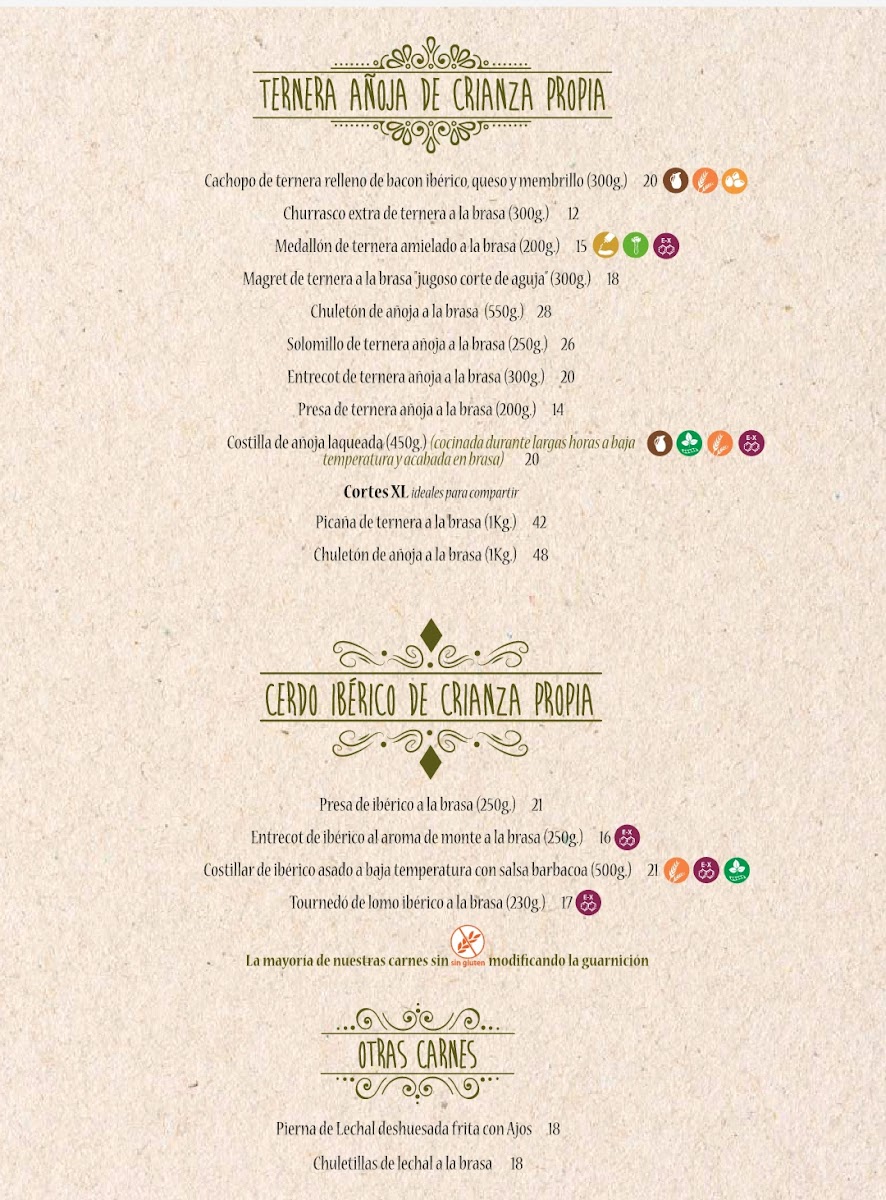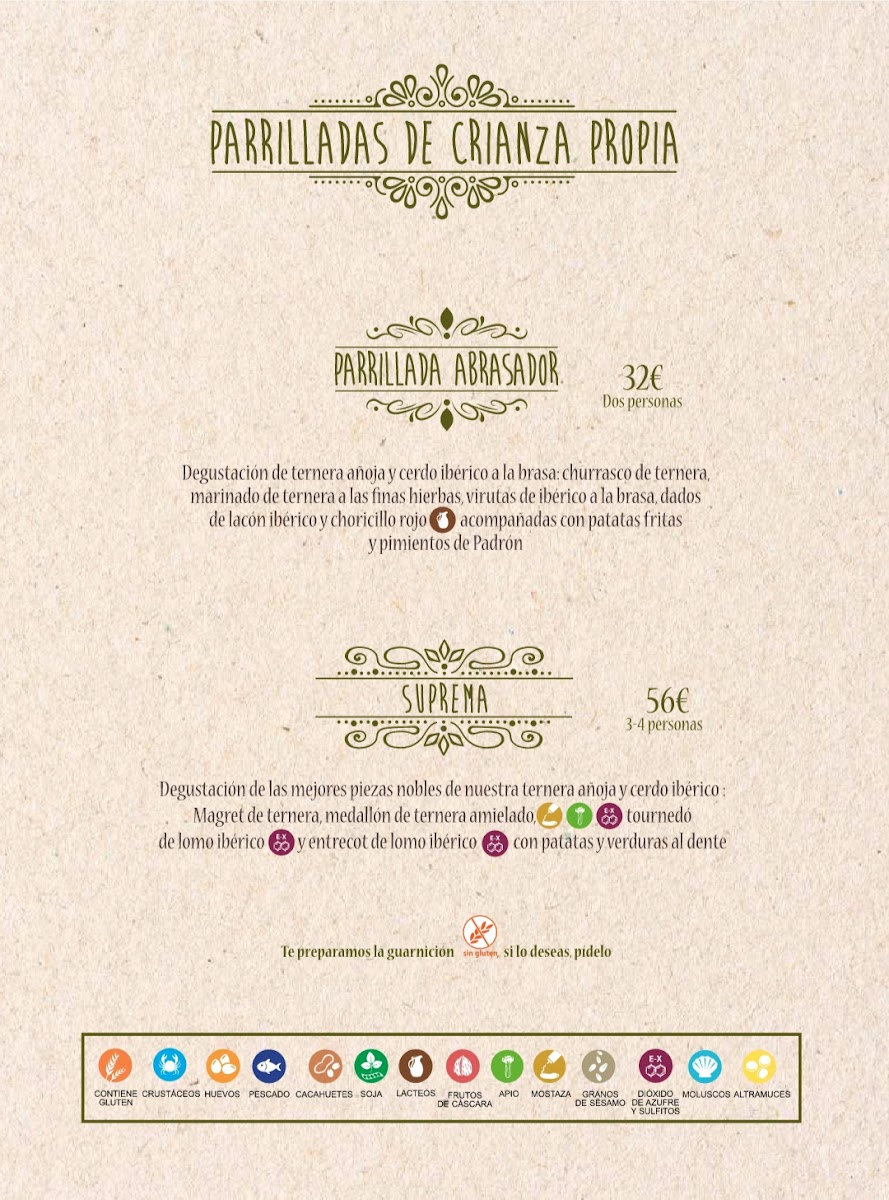 Degustación de las mejores piezas nobles de nuestra ternera añoja y cerdo ibérico de Crianza propia: Magret de ternera, medallón de ternera amielado, tournedó de lomo ibérico y entrecot de lomo ibérico acompañadas con patatas fritas y verduras al dente.
